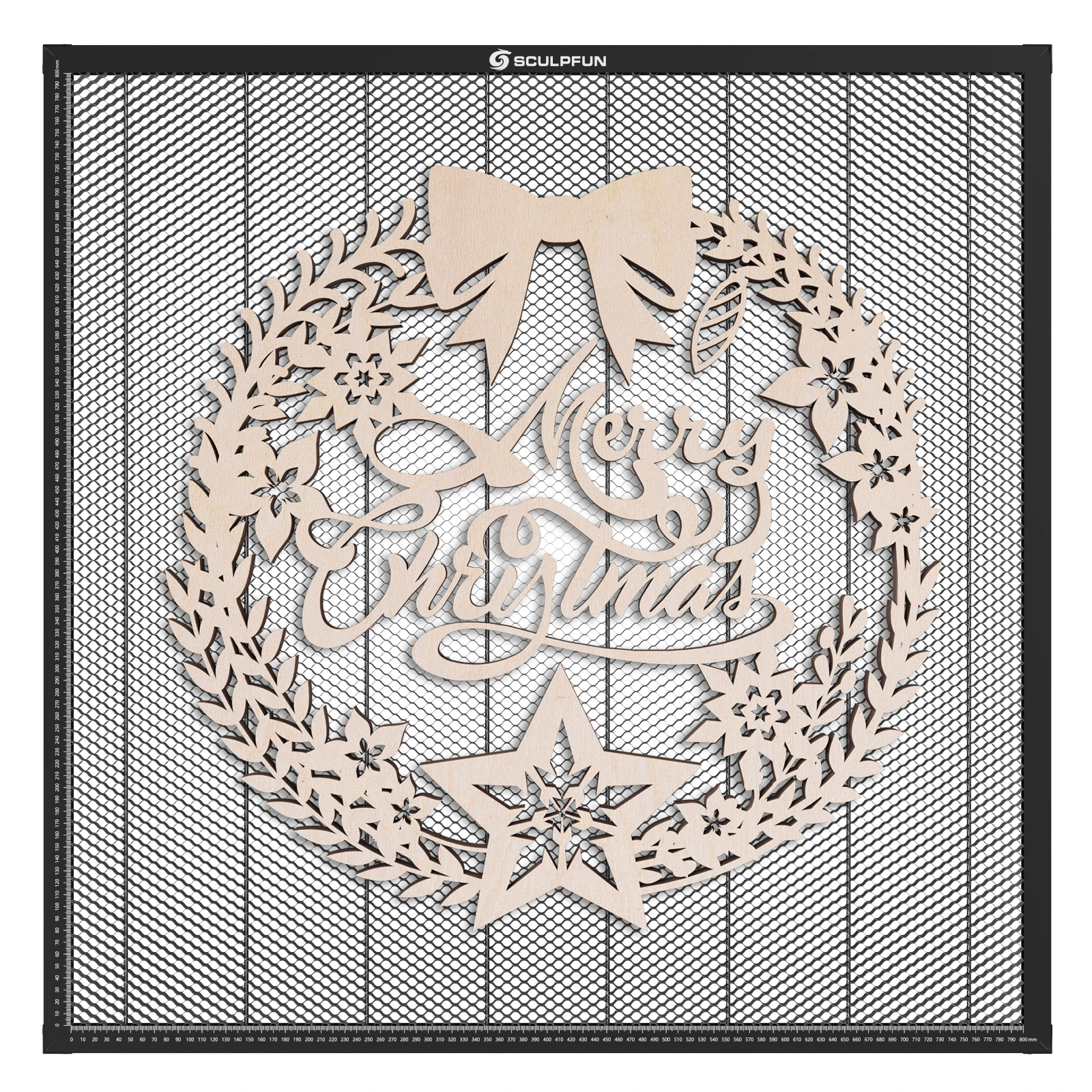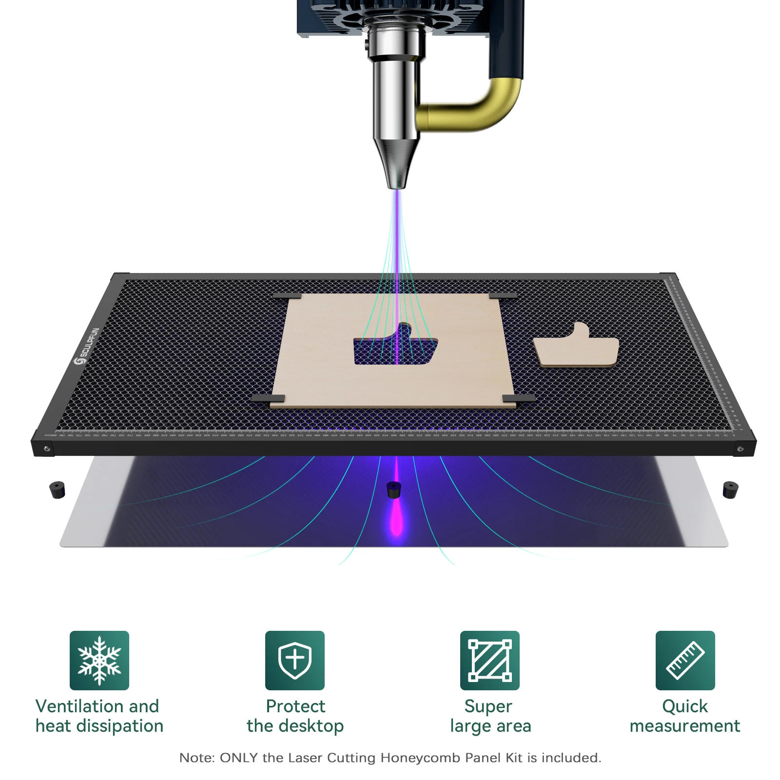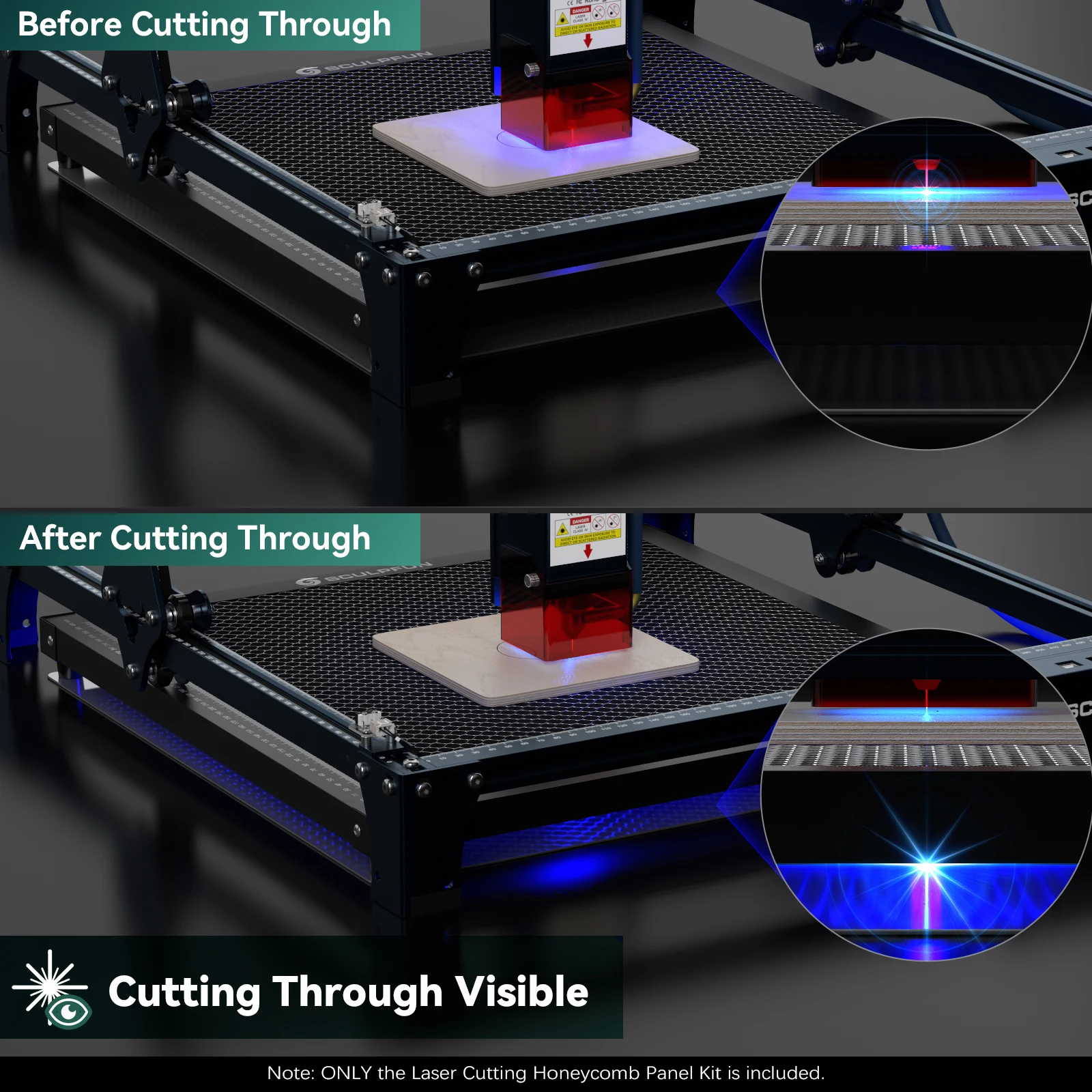 ? Observable design for cutting through: SCULPFUN honeycomb panel has a very convenient cutting observation design. When the laser cuts through the wood or acrylic, the metal backing plate at the bottom of the honeycomb panel will emit bright light, which means that the cutting has penetrated. It solves the problem that it is difficult for ordinary engraving machines to judge whether to cut through.