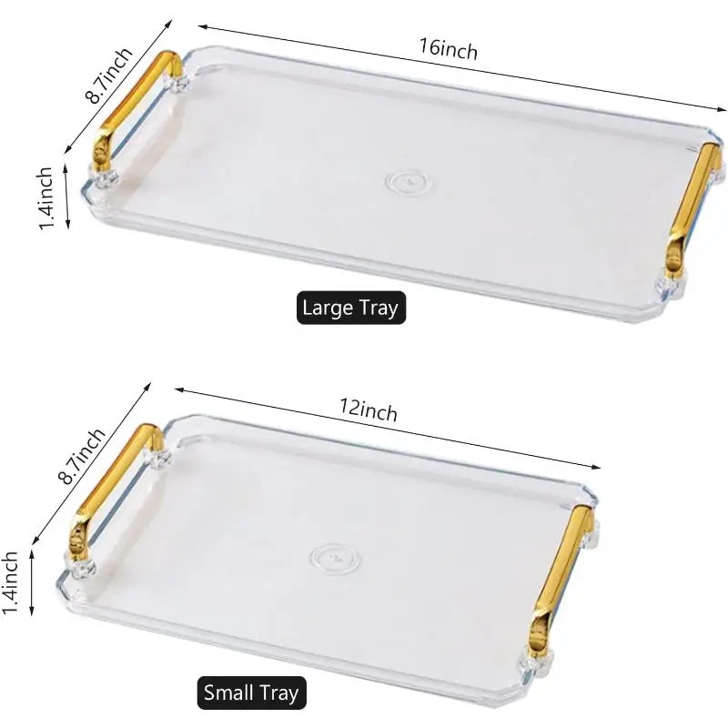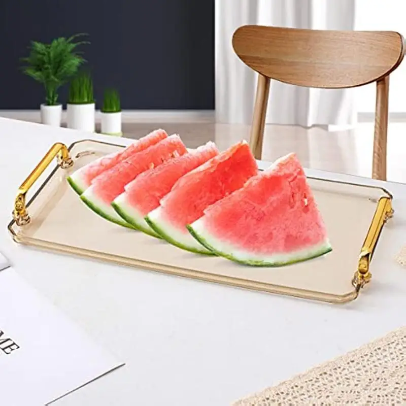 BEAUTIFUL. Clear serving tray with gold handles make eye-catching items. The serving tray itself is a kind of great decoration for home, salon, office, restaurant, café, bar, and so on.