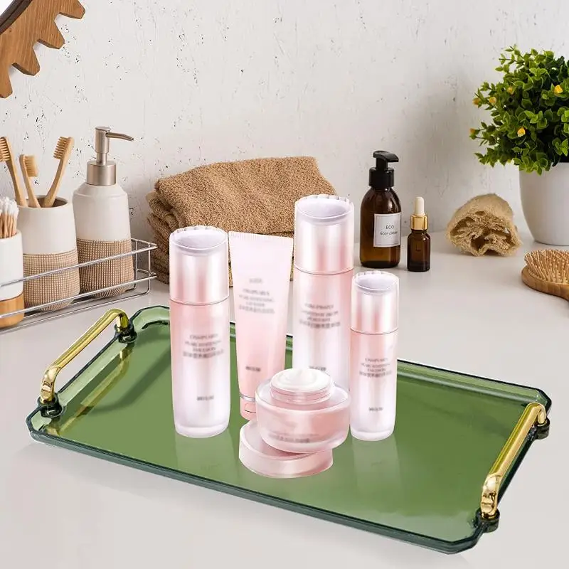 BEAUTIFUL. Clear serving tray with gold handles make eye-catching items. The serving tray itself is a kind of great decoration for home, salon, office…