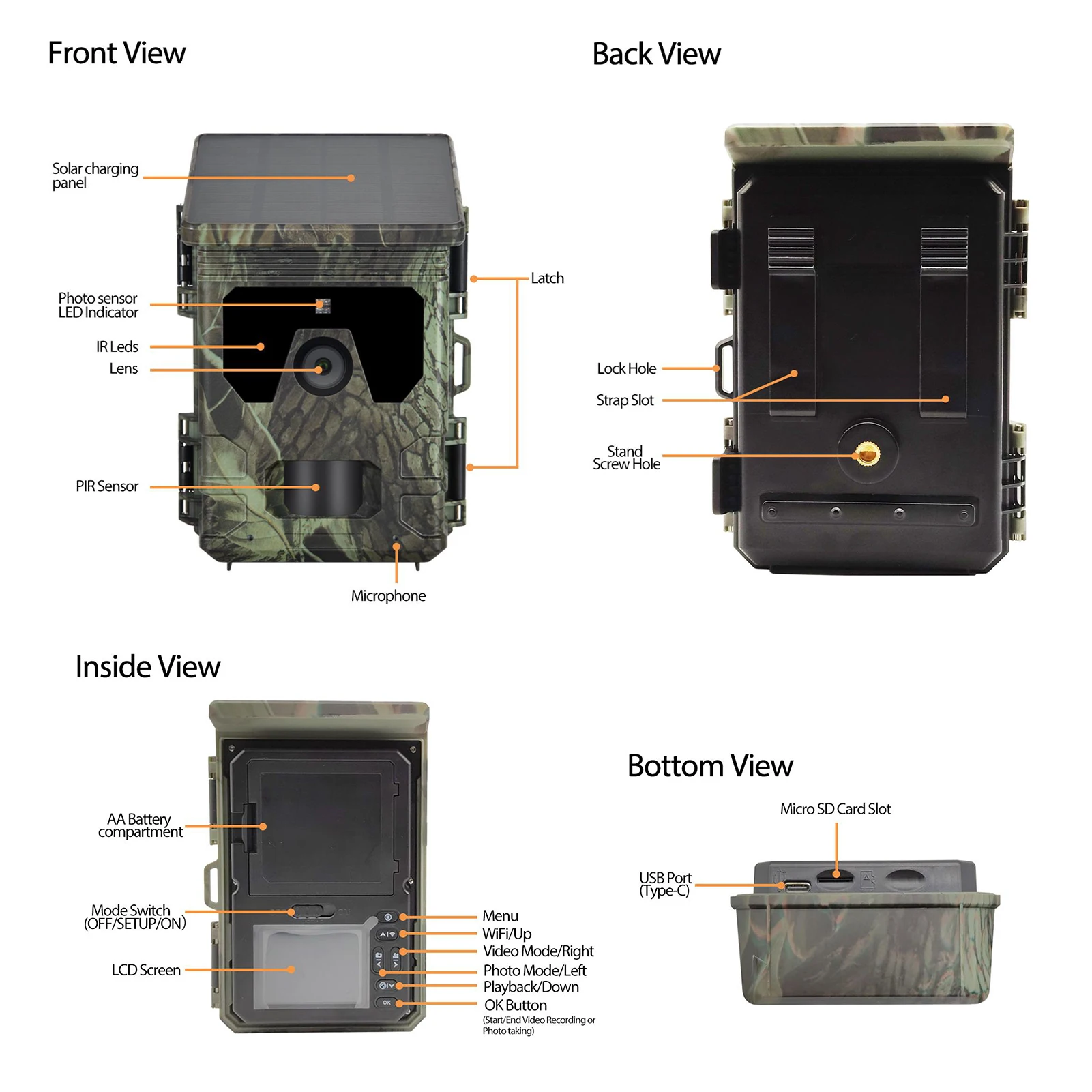 Solar-powered trail camera with built-in lithium battery, perfect for wildlife monitoring, outdoor deer hunting, and home security. Say goodbye to frequent battery replacement.