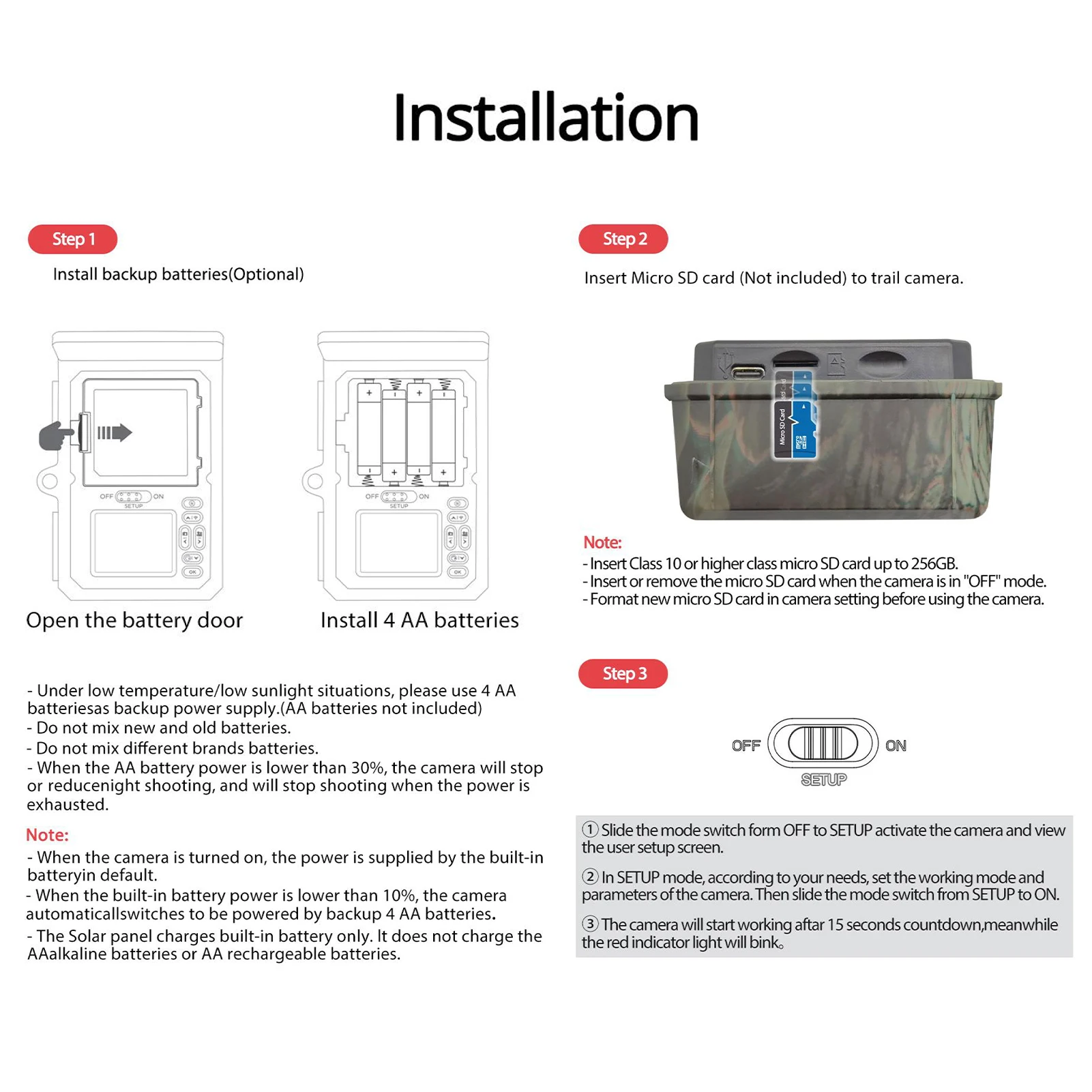 This solar trail camera supports a memory card of up to 256GB, allowing you to take more pictures and videos.