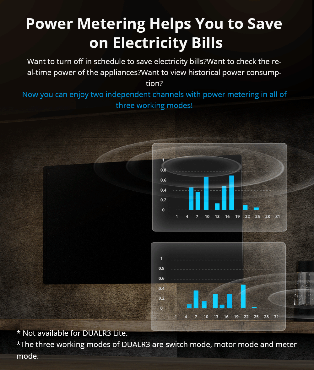 Want to turn off in schedule to save electricity bills?Want to check the real-time power of the appliances?Want to view historical consumption?Now you can enjoy two independent channels with power metering in all of three working modes!