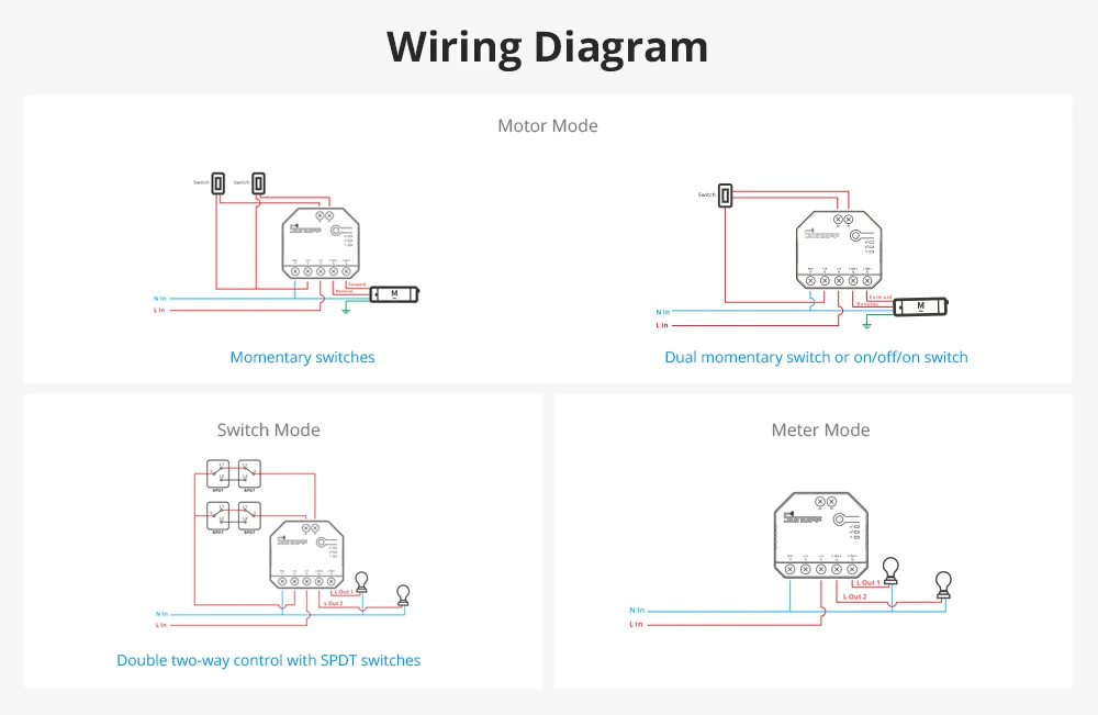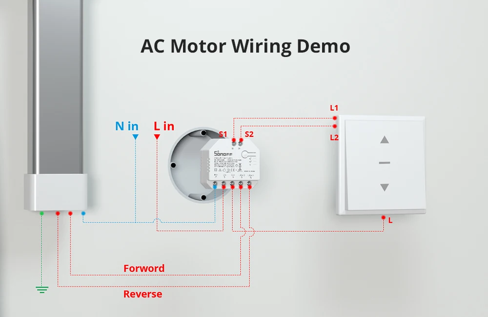 DUALR3/DUALR3 Lite can operate as a smart control module for a 100-240V AC motor, like the tubular motor for bi-directional motorized curtains, blinds, roller shutters, awnings, etc.Note: 1. DUALR3/DUALR3 Lite is applicable to four wires(GND, neutral, Forward, and Reverse) AC motors, like tubular motors.2. The motor connected to DUALR3 needs a travel limited function, otherwise, it cannot be calibrated. Click this link to learn more.