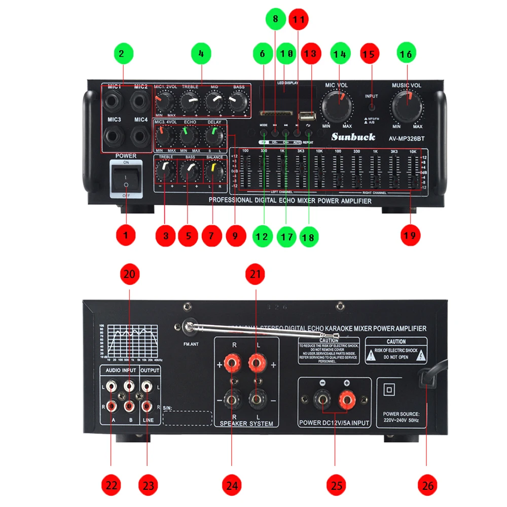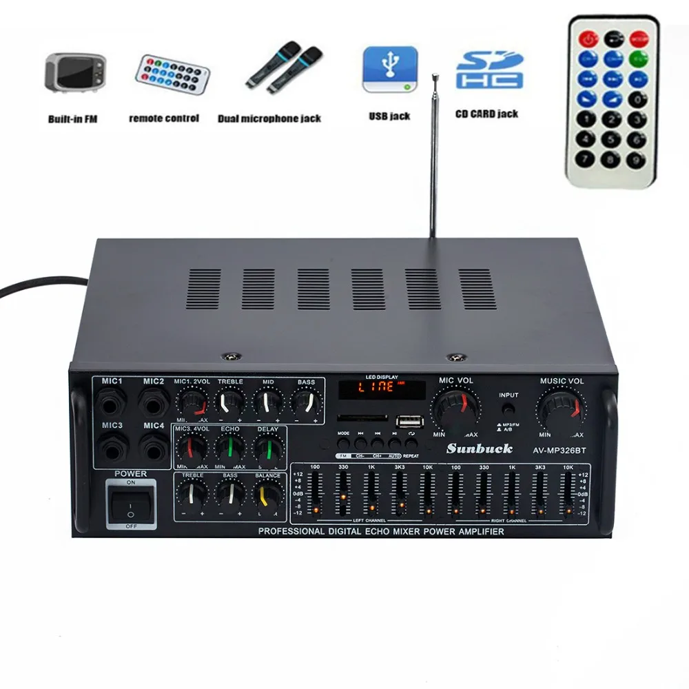 Sunbuck karaoke Sound amplifier 2.1 Channel 200W*2 High Power FM USB MP3 10 Segment Audio equalizer Car Bluetooth amplifierBrand:SunbuckModel:AV-MP326…