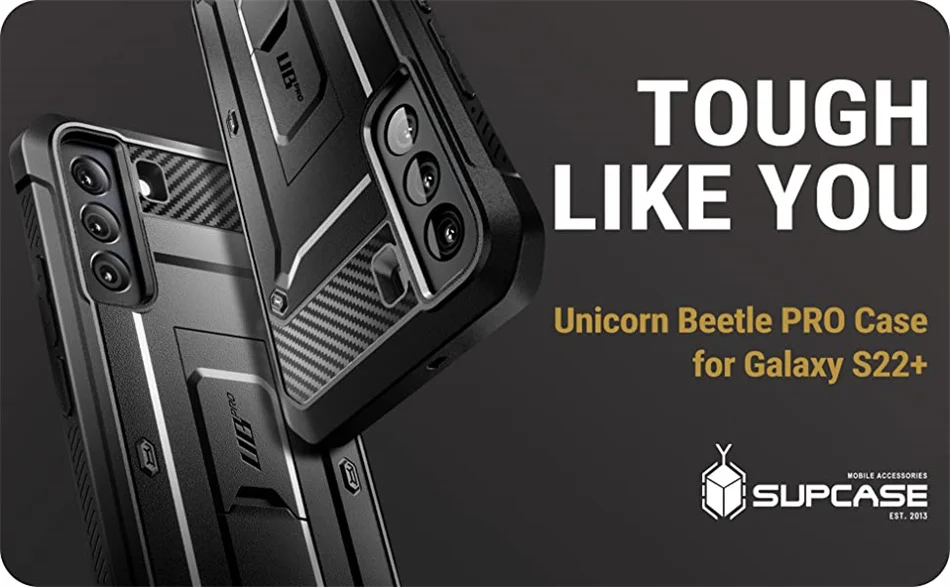 Fortify your Galaxy S22 Plus with the legendary Unicorn Beetle Pro by SUPCASE! Slim, sturdy, and built to take a beating, you'll enjoy 360° protection from dirt, dust, drops, and even the kids! Packed with TPU polycarbonate, precise cutouts and a bonus kickstand for handsfree video content, it truly lives up to its reputation.