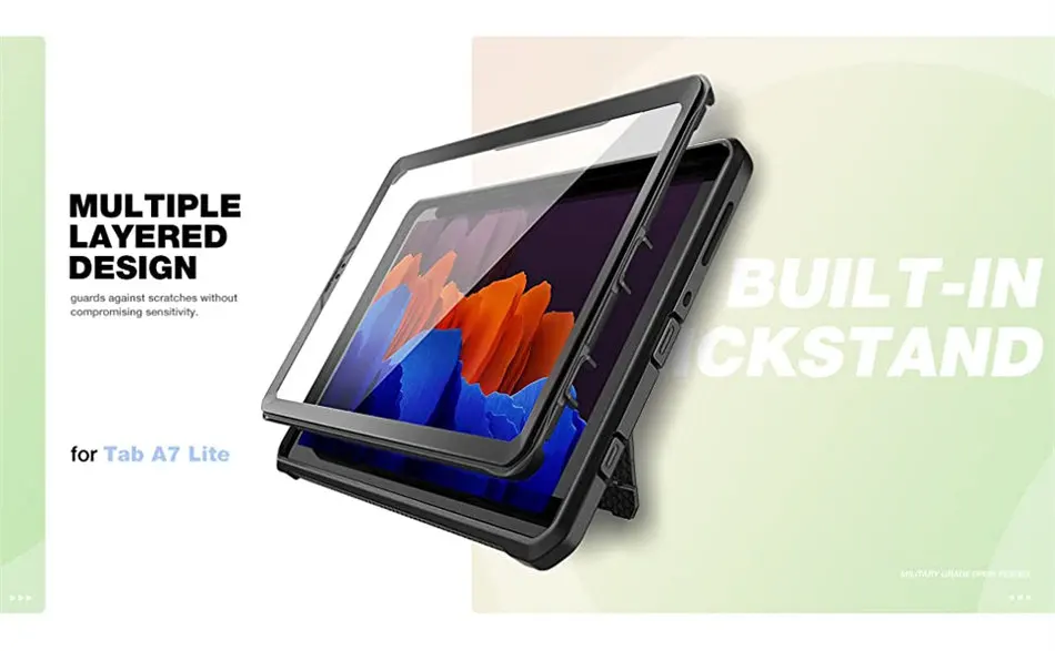 The UB Pro provides reliable rugged protection for your Galaxy Tab A7 Lite 8.7 Inch (2021 Release)Constructed in two parts, this case features a front protective piece with raised edges to keep your iPad screen up off surfaces and a back piece that's made of both shock-absorbing TPU and hard, drop-resistant Polycarbonate materials. Additionally, the UB Pro features an integrated kickstand that slides out for convenient video watching at home or on the go!