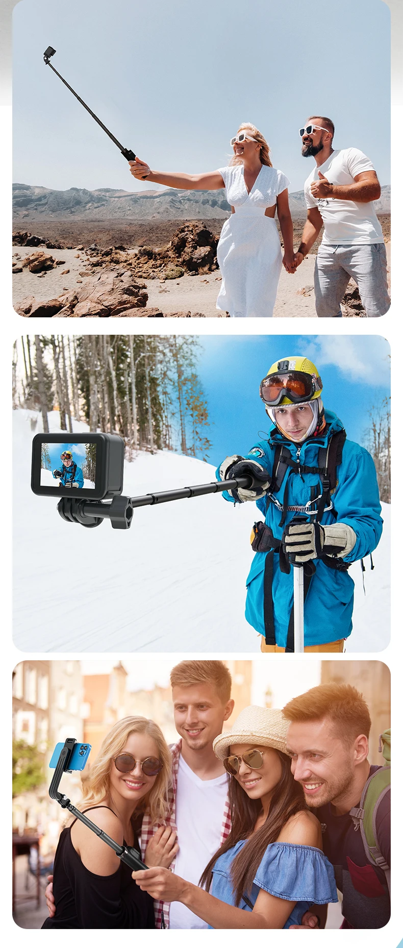 4. Selfie stick come with a phone clip and gopro interface.When taking a selfie with a mobile phone,you can switch between horizontal and vertical shots.