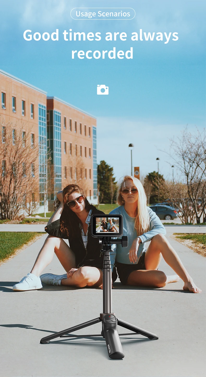 2. Wireless Bluetooth remote control can control gopro shoot photos,video record and time-lapse photography.Control range is about 72 meters in an open area.The back of the remote control is magnetic and can be attached to the selfie stick,freeing your hands.