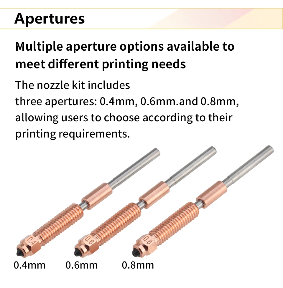 The nozzle kit includes three apertures: 0.4mm, 0.6mm.and 0.8mm,allowing users to choose according to their