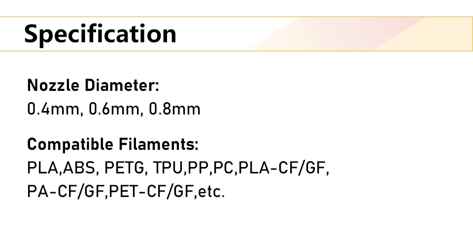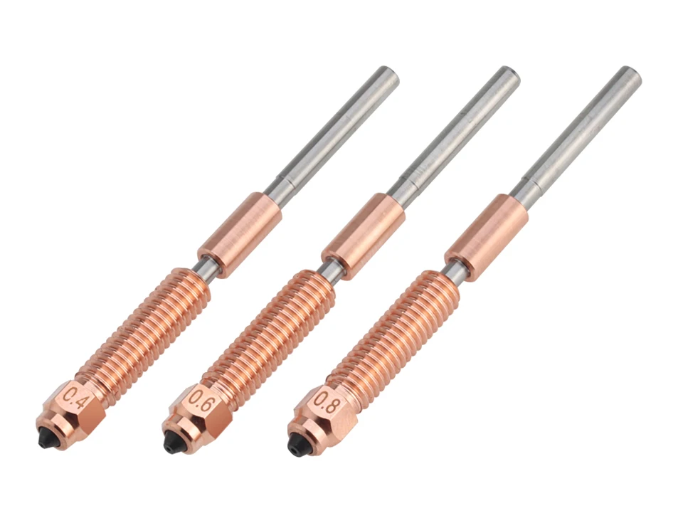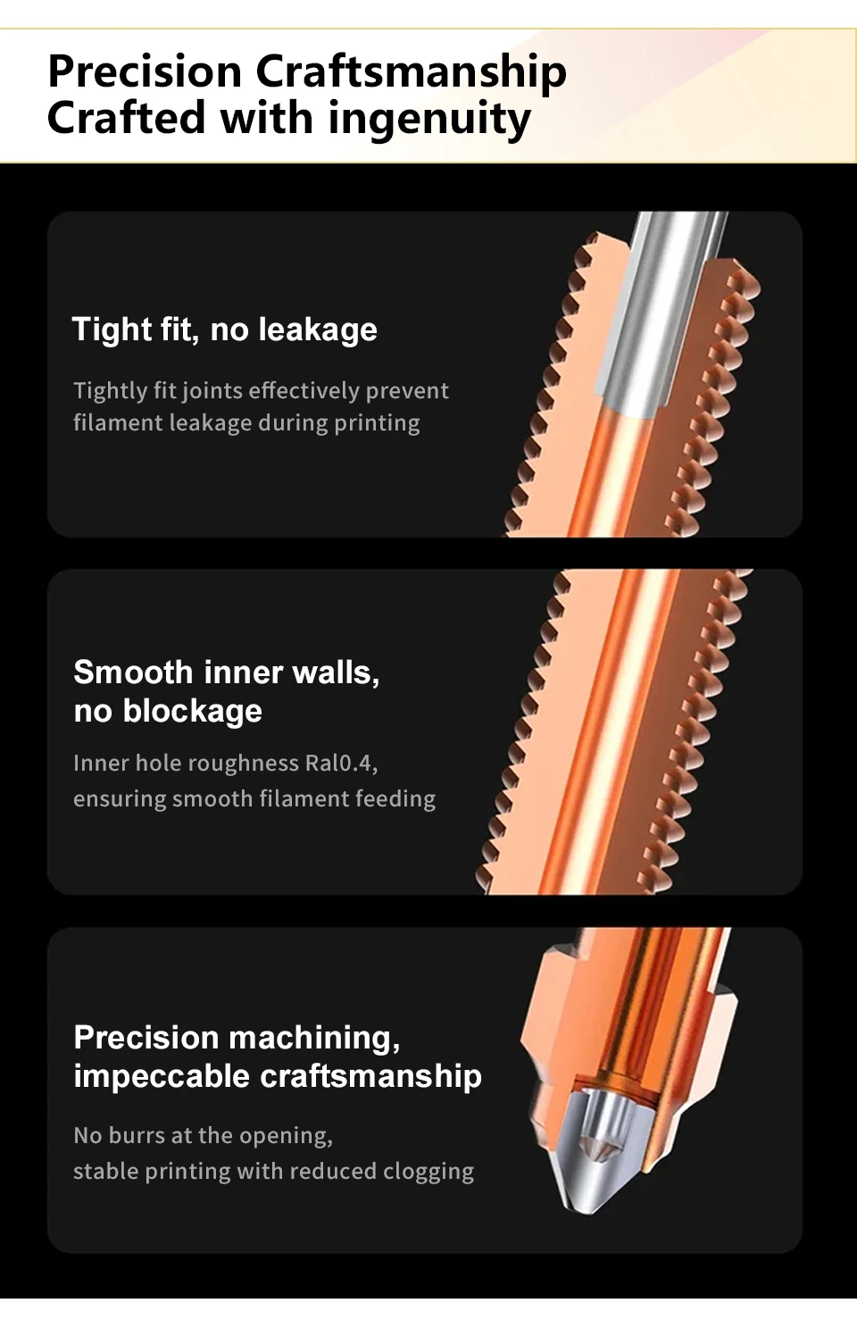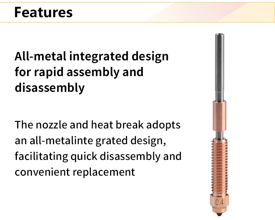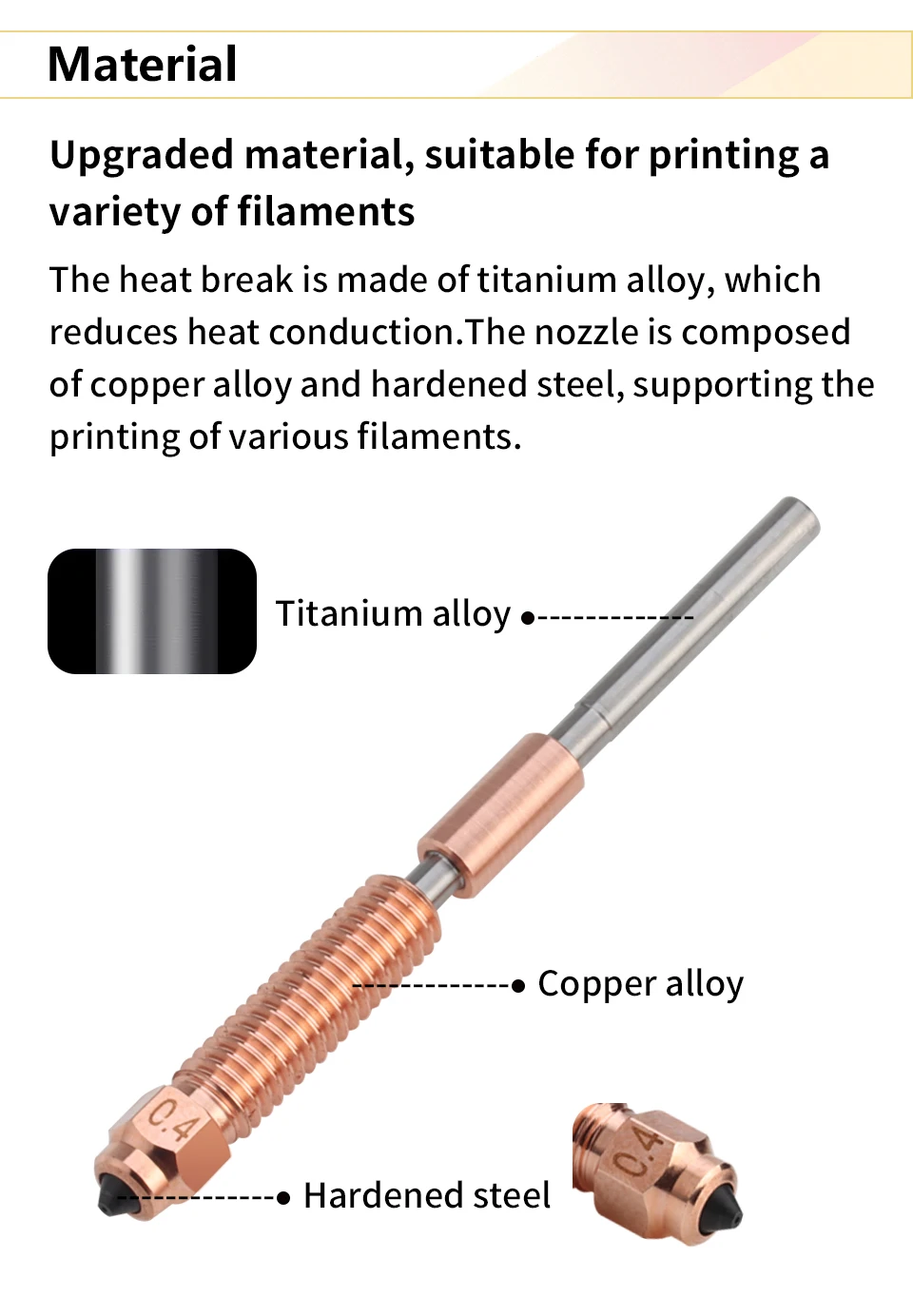 The heat break is made of titanium alloy, which reduces heat conduction.The nozzle is composed of copper alloy and hardened steel, supporting the printing of various filaments.