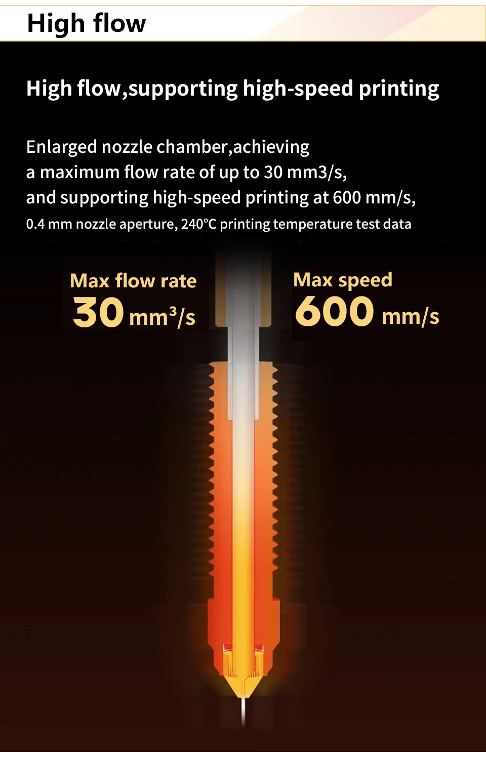 Enlarged nozzle chamber,achieving a maximum flow rate of up to 30 mm³/s,and supporting high-speed printing at 600 mm/s,0.4 mm nozzle aperture, 240℃ printing temperature test data