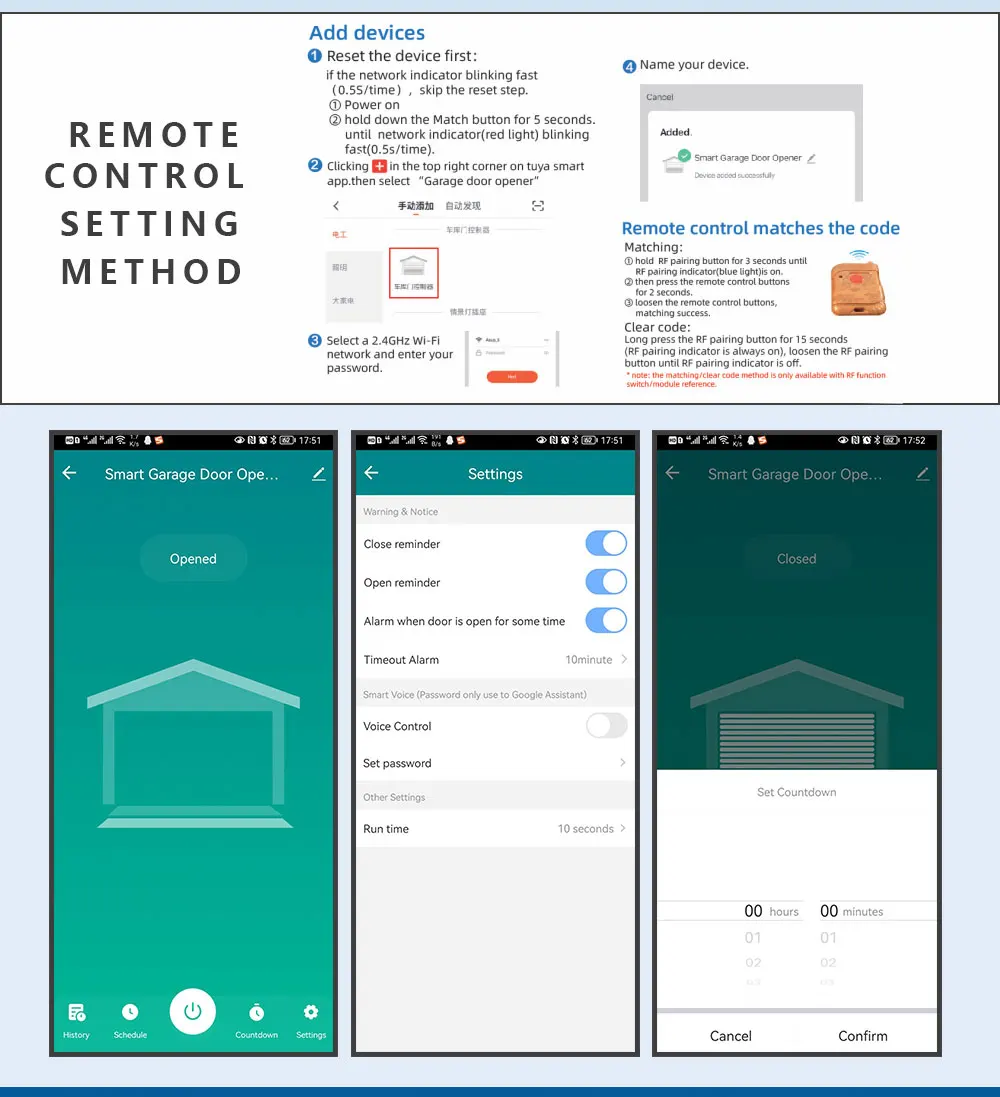 COUNTDONW FUNCTION: You can set the countdown time to close or open the garage door.