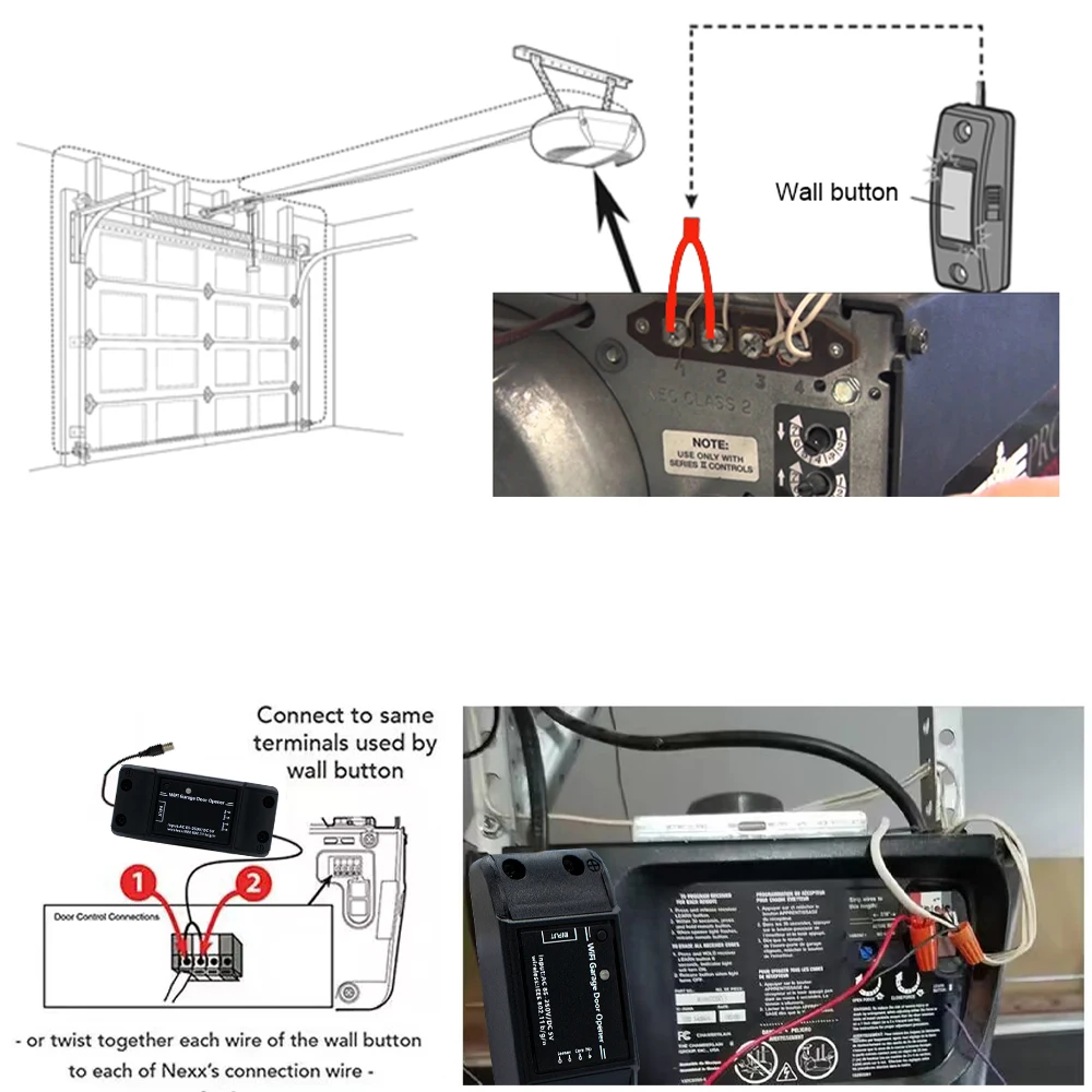 Take a wire with both ends stripped or a straightened-out paper clip to short-circuit the wall button terminal on the opener (I marked with red color). If the garage door opens or closes, it can work with our smart controller.