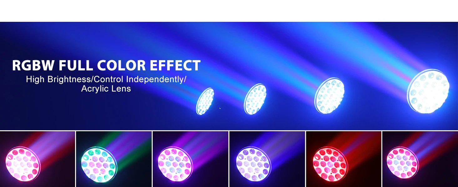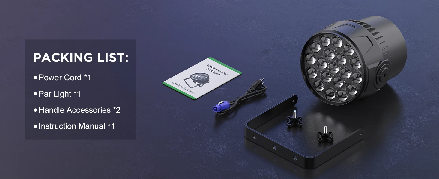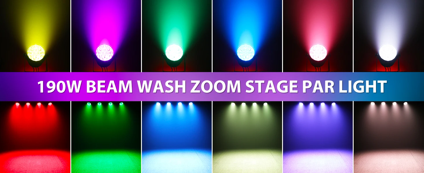 1.【High Power Lighting】 The Par Light features 19X10W RGBW LED light sources, high-brightness acrylic lens, and divided into three layers of inner/middle/outer circle control, which is suitable for stage performances, concerts, speeches and other places that require high-brightness lighting.