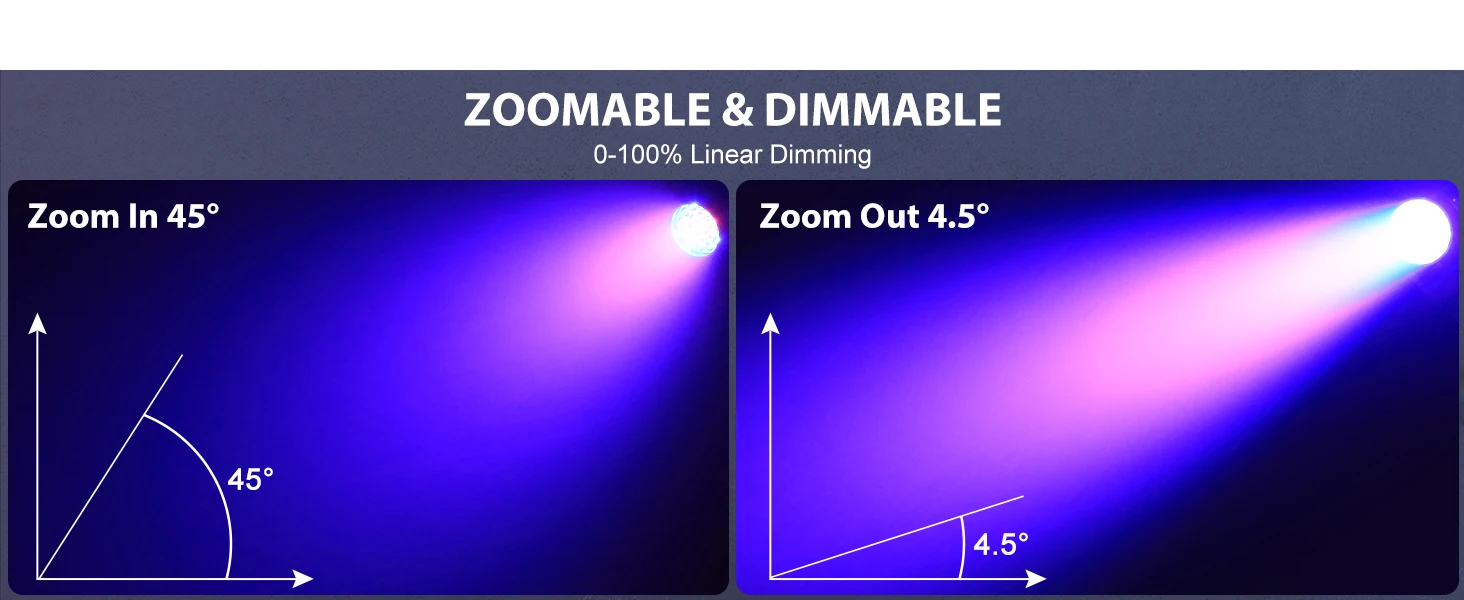 3. 【Dual Focus Method】 The Light with electronic focusing function, 4.5-45° zoom range, users can focus and defocus the light through the console or manual operation as needed, and adjust the projection angle and range of the light.