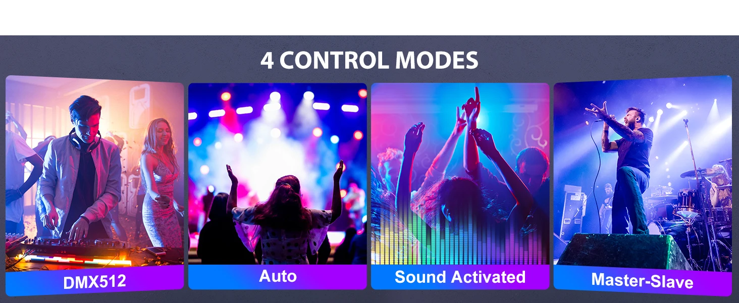 4. 【4 Control Mdes】The lamp supports multiple working modes, such as automatic mode, voice control mode, DMX control mode, etc. Users can choose the appropriate mode according to their needs to achieve different lighting effects.