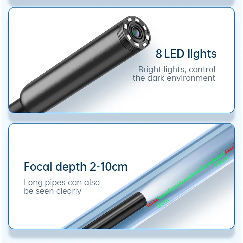 1. 8mm Diameter Camera & Semi-rigid Cable Endoscope : The USB Endoscope camera probe is ultra-thin, only 8mm, we can use this Endoscope in many hard-to-reach, narrow, and confined places at home or outdoors, such as HVAC, vent pipe, engines, air conditioners, sofa corners, bathtub pipes, toilets, etc. Unlike similar USB borescopes with soft cables, this one comes with a semi-rigid cable that can be forwarded to the narrower place more easily.