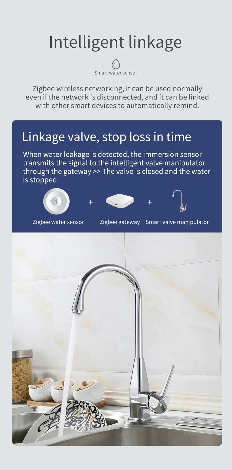 【Real-time detection】 The water immersion sensor can detect water leakage in the environment in real time. When water immersion is detected, the detector will send an alarm signal to the host and report the information to the user's mobile phone. When the water level at the detection point reaches 0.01M, the water intrusion sensor will report the water condition.