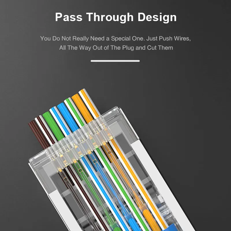 The pass-through function allows the wires to pass all the way through the plug to let you verify they are in the correct order before crimping the plug